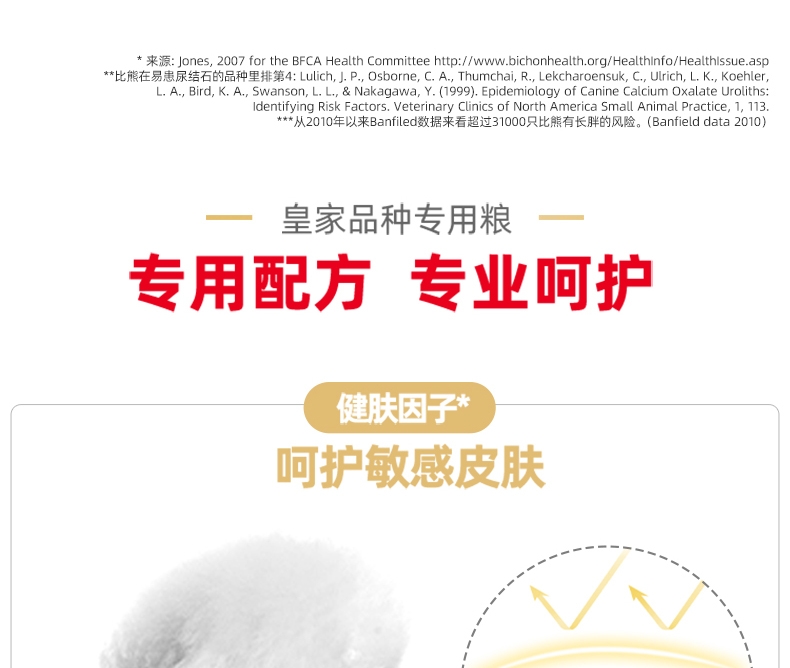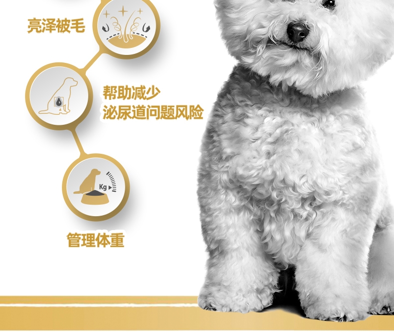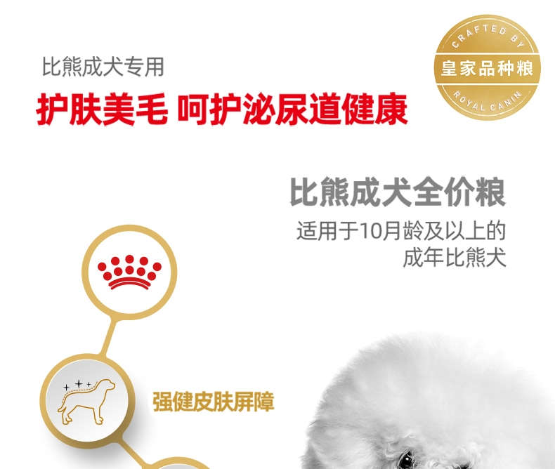 法国皇家ROYAL CANIN 比熊成犬粮3kg BF29,专为比熊成犬量身定制的配方,鱼油中富含的EPA和DHA成分有助于减少皮肤疾病风险,丰厚被毛,同时专利营养复合维生素增强皮肤屏障功能,营养毛发,恢复亮泽。科学设计的低镁配方,有效降低爱犬泌尿结石的发生,呵护泌尿系统健康。营养均衡,同时限制热量含量,有助于爱犬保持理想体重,呈现理想体态。