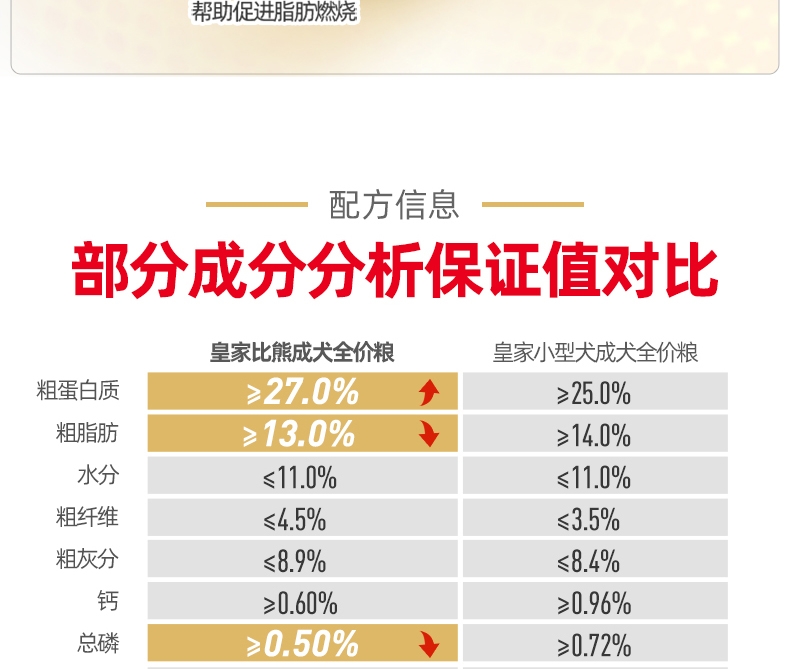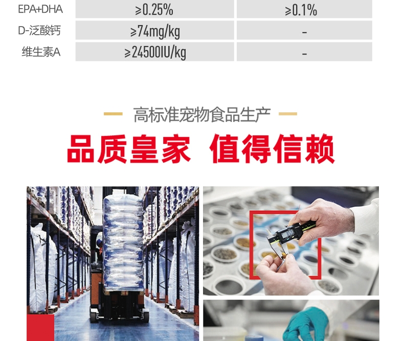 鸡肉粉,鸭肉粉,鸡肉骨粉,鸭肉骨粉,小麦,大米,牛油,鸡油,小麦粉,纤维素,谷朊粉,狗粮口味增强剂,菊苣渣,啤酒酵母粉,矿物元素及其络(螯)合物(硫酸铜,硫酸亚铁等),大豆油,鱼油,维生素(A,E,D3,氯化胆碱等),车前子,牛磺酸,沸石粉,果寡糖,三聚磷酸钠,天然叶黄素(源自万寿菊),L-半胱氨酸,DL-蛋氨酸,葡萄糖胺盐酸盐,BHA,没食子酸丙酯,防腐剂(山梨酸钾),L-肉碱,茶多酚,硫酸软骨素。 主要成分: